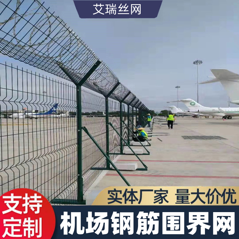 機場飛行區圍界多由Y型立柱+鋼筋焊接網片+蛇腹式刀刺網組合而成,大多數時候叫做機場鋼筋網圍界、機場鐵絲網圍界或者機場防護網,但是這類防護網不只是應用在機場。由于這種鋼筋網結構有很好的隔離和防攀爬功能,可以應用在很多地方,例如廠區、園林、軍事、邊防等等。安平縣艾瑞絲網生產的機場圍界網,專注于高質量、高全性,隨著市場的不斷更新迭代,我們出品了多款機場鋼筋網圍界,滿足不同地域、不同級別、不同環境的需求。