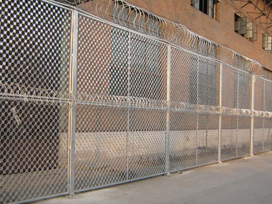 4、監(jiān)獄鋼網(wǎng)墻防攀爬能力極強(qiáng)、加強(qiáng)網(wǎng)片增加了其被破壞的程度、使用時間長、堅(jiān)固耐用。螺旋型交叉刀片刺網(wǎng)是在兩條刀片刺網(wǎng)之間以不銹鋼片和鍍鋅鋼片強(qiáng)力夾扣,展開后即呈交叉狀,美觀又實(shí)用。