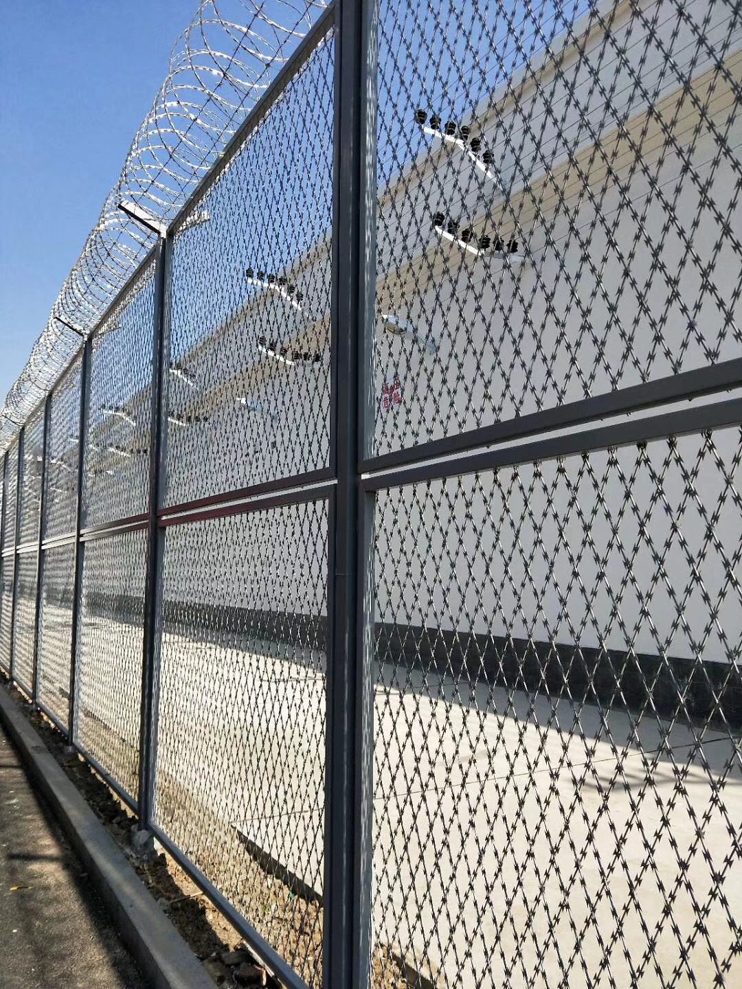 監獄鋼網墻又稱作"Y型安全防御護網”,是由V型支 架立柱加強型焊接片網,安全防盜連接件和熱鍍鋅刀片刺籠組成強度和安全